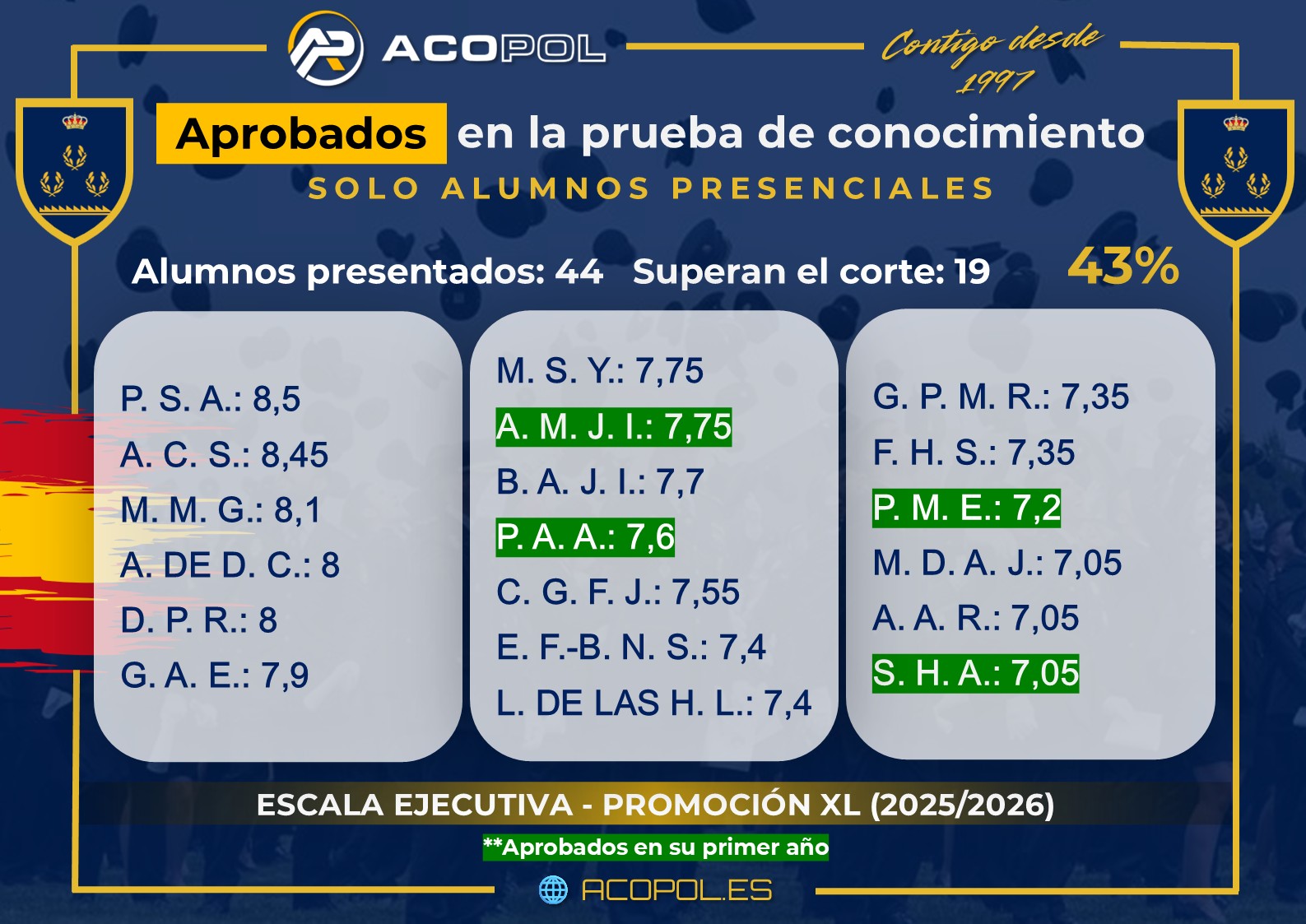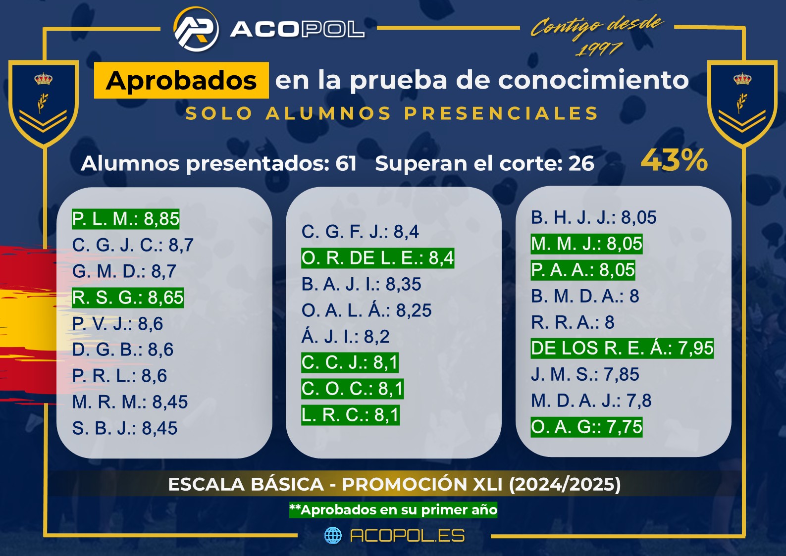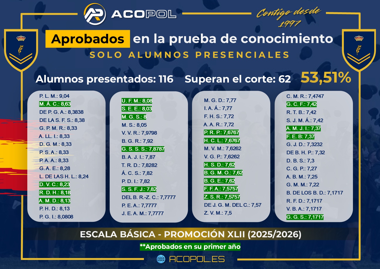 En ACOPOL publicamos los resultados de nuestras promociones con un objetivo muy claro: transparencia, seguimiento y mejora continua. Aquí podrás consultar, de forma organizada, los resultados obtenidos por nuestros alumnos en las distintas convocatorias de Escala Básica y Escala Ejecutiva de la Policía Nacional.